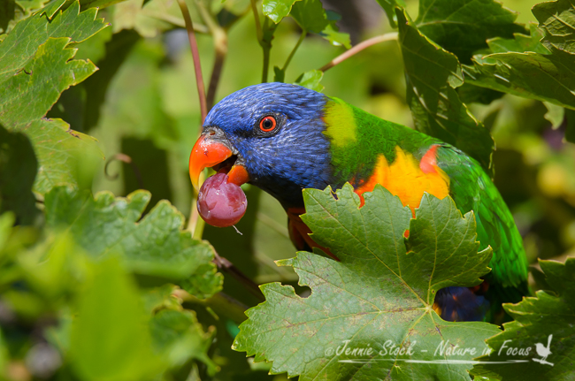 Previous ImageNext Image Rainbow Lorikeet sneaking a grape©Jennie Stock – Nature in focus Rainbow Lorikeet sneaking a grape in the garden